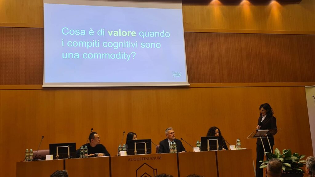 La tavola rotonda è stata il cuore pulsante dell’evento. Don Andrea Ciucci della Pontificia Accademia per la Vita ha offerto una riflessione profonda sul valore etico della tecnologia, sottolineando la necessità di mantenere la centralità della persona e la dignità del lavoro anche nell’era delle macchine intelligenti. Elisabetta Bracci ha invece esplorato il tema della collaborazione tra intelligenza artificiale e intelligenza emotiva, portando esempi concreti di innovazione etica e mostrando come una “workforce ibrida” possa rappresentare una soluzione vincente per affrontare le sfide del futuro.