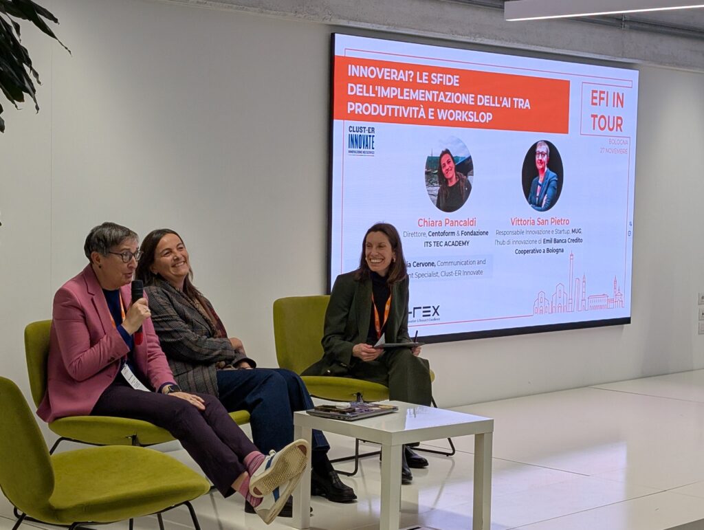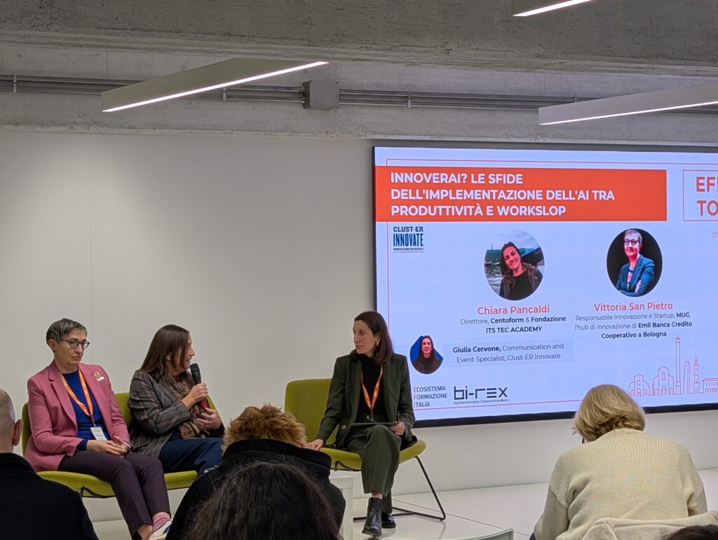 In parallelo, Giulia Cervone, Communication and Event Specialist del Clust-ER Innovate, ha moderato una tavola rotonda dal titolo “InnoverAI? Le sfide dell’implementazione dell’AI tra produttività e workslop”. L’incontro ha visto la partecipazione di Chiara Pancaldi, Direttore di Centoform & Fondazione ITS TEC ACADEMY, e Vittoria San Pietro, Responsabile Innovazione e Startup presso MUG – l’hub di innovazione di Emil Banca. Durante la discussione si è parlato delle opportunità e delle difficoltà legate all’adozione dell’intelligenza artificiale nelle imprese, con un focus su produttività e benessere lavorativo.