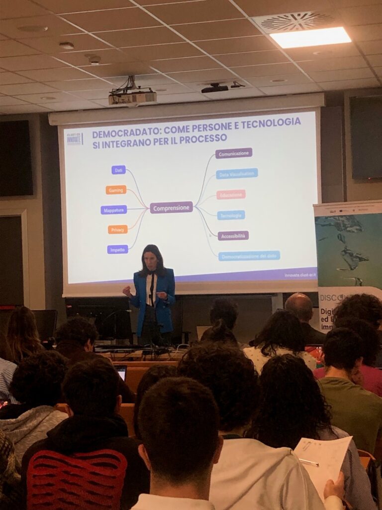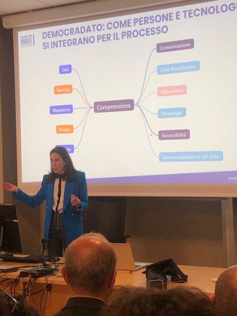 Successivamente, Giulia Cervone che ha rappresentato il Cluster Innovate ha illustrato il concetto di “Democradato”, un’interessante riflessione su come l’integrazione tra persone e tecnologie possa alimentare il progresso. Il suo intervento ha aperto la strada a una discussione più ampia sul ruolo della tecnologia nella vita quotidiana e nelle sfide future.